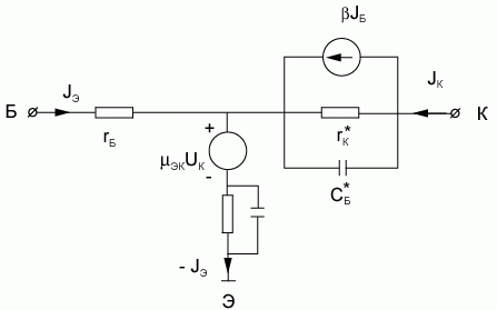 Физическая эквивалентная схема составляется для переменных токов и напряжений, но при условии, что эмиттерный переход находится под прямым напряжением, а коллекторный переход - под обратным напряжением, а амплитуды сигналов таковы, что транзистор работает в линейном режиме.