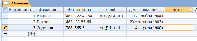 Создание оперативной таблицы «Абоненты»
