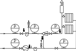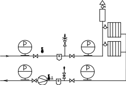 Выбор схемы присоединения систем водяного отопления к тепловой сети при отсутствии пьезометрического графика определяется лишь температурой воды в сети: при расчетной температуре 95/70°C применяется непосредственное (зависимое) присоединение: при перегретой воде – непосредственное с элеватором для подмешивания обратной воды. Схемы узлов присоединения и необходимая арматура представлены на рис.5.