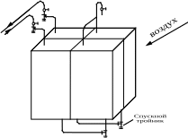 В проекте предусматривается использование одноходовых пароводяных калориферов моделей КЗПП и К4ПП и многоходовых водяных моделей КЗВП и К4ВП. Эти калориферы выполняются стальными пластинчатыми. Многоходовые калориферы устанавливаются горизонтально и имеют одностороннее боковое расположение патрубков. При теплоносителе воде следует применять преимущественно многоходовые калориферы и последовательное соединение по теплоносителю как многоходовых, так и одноходовых калориферов (рис.6). Калориферные остановки компануются из нескольких однотипных калориферов в один или два ряда по ходу воздуха. Каждый ряд может содержать от одного до 10-12 калориферов.