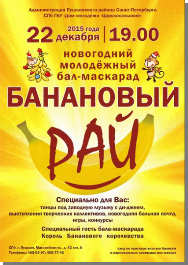 - •Сценарий новогоднего праздника для молодежи «Банановый рай»