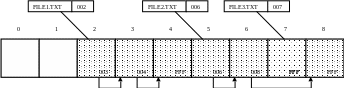 На рисунке показано три файла. Файл FILEl.IXT является достаточно большим; он задействует три следующих друг за другом распределяемых блока. Небольшой файл FILE3.ТХТ использует пространство только одного размещаемого блока. Третий файл, FILE2.ТХТ, является большим фрагментированным файлом. В каждом случае точка входа указывает на первый распределяемый блок, принадлежащий файлу. Если файл использует несколько распределяемых блоков, то предшествующий блок указывает на следующий в цепочке. Значение FFF отождествляется с концом последовательности.