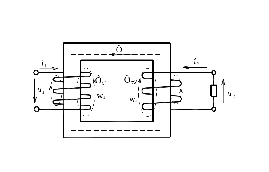 На схеме изображены основные части: ферромагнитный сердечник, две обмотки на сердечнике. Первичную обмотку включают в сеть с переменным напряжением, её намагничивающая сила i1n1 создает в магнитопроводе переменный магнитный поток Ф, который сцеплен с обеими обмотками и в них индуцирует ЭДС e1= -n1dФ/dt, e2= -n2dФ/dt. При синусоидальном изменении магнитного потока Ф = Фm sinωt , ЭДС равно e = Em sin (ωt-π/2).