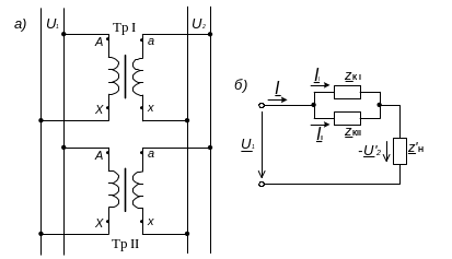 Схема включения трансформаторов при параллельной работе (а) и схема их замещения (б)