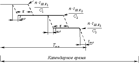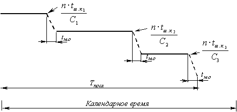 а длительность производственного цикла Тпосл включает дополнительно межоперационные перерывы, длительность естественных процессов и перерывы, связанные с режимом работы участка и завода (рис. 11):