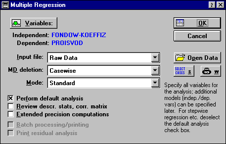 Высветив имена переменных, как показано на рисунке, нажмите кнопку ОК в правом верхнем углу окна Select dependent and independent variable list. Вы вновь окажитесь в стартовой панели модуля. Переменные для анализа выбраны.