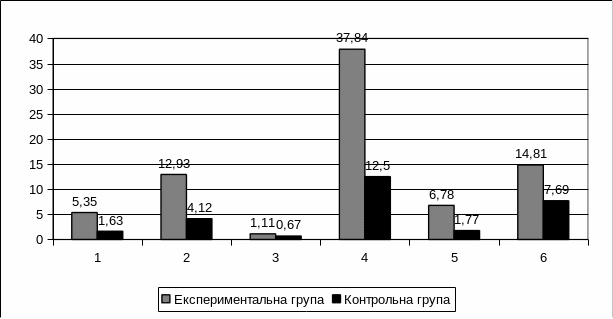 Рисунок 1. Порівняння рівня приросту швидкісно-силових якостей баскетболістів 14-15 років експериментальної та контрольної групи протягом експерименту