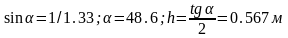 В дно водоёма глубиной 2,0 м вбита свая, на 0,75 м выступающая из воды. Найти длину тени от сваи на поверхности и на дне водоёма, если высота солнца над горизонтом в данный момент равна 45º.