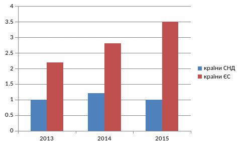 ПАТ «Автобаза№1» надає транспортні послуги вантажним автомобільним транспортом по Україні, Росії, Білорусі та країнам Західної Європи - Німеччина, Бельгія, Голландія, Данія. Виходячи с цього можна проаналізувати динаміку перевезення в цих країнах (Рис.2.2. Міжнародні перевезення в країни СНД в 2015 р.млн.грн. за 2013-2015рр.)