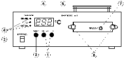 Рис. 4. Зовнішний вигляд термостата та органи керування: (1) - кнопки “ВСТАНОВЛЕННЯ –”, “ВСТАНОВЛЕННЯ +” - задають температурну межу вимірювання; (2) - кнопка “ВИМІРЮВАННЯ” - слугує для виводу на табло індикації поточного значення термператури у камері термостату; (3) - вимикач “МЕРЕЖА”; (4) - світлодіоди “БІЛЬШЕ”, “НОРМА”, “МЕНШЕ” - для контролю поточної температури щодо заданої; (5) - інди-каторне табло “С” відображає значення наперед заданої або поточної тем-ператури; (6) - касета для розміщення зразка; (7) - вихід з’єднувальних ка-сетних шнурів; (8) - затискачі