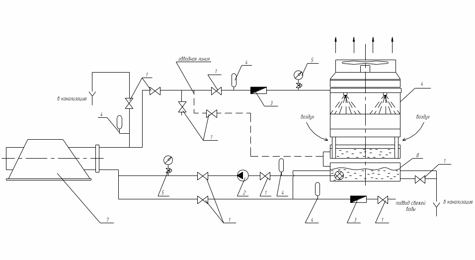 1 – вентиль запорный; 2 – насос центробежный; 3 – водомер; 4 – термометр; 5 – манометр пружинный; 6 – градирня; 7 – охлаждаемое оборудование; 8 – промежуточный бак.