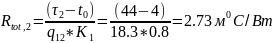 Примем по приложению №14 методического пособия, нормируемые линейные плотности тепловых потоков для подающего q11 = 60.1 Вт/м и обратного q12 = 18.3 Вт/м трубопроводов. Определим суммарные термические сопротивления для подающего Rtot,1 и обратного Rtot,2 трубопроводов при К1= 0.8 (см. приложение №20)