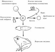 2.2. Подтверждением положения о том, что цитоплазма яйцеклетки содержит полный набор индукторов, способных включать в работу все необходимые блоки генов, служат опыты Дж.Гердона (1964-1966 гг). В яйцеклетку лягушки с удалённым ядром он пересаживал ядро соматической клетки (эпителия кишечника или кожи). В большинстве случаев из такой яйцеклетки развивались нормальные головастики и даже взрослые лягушки. Эти опыты доказывают, что ядра соматических клеток содержат полную генетическую информацию о развитии целого организма, а цитоплазма яйцеклетки - полный набор индукторов для включения всех нужных блоков генов.