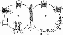 а — безстатеве розмноження; б — статеве розмноження; М — мейоз; / — вегетативна особина; 2 — утворення зооспор; 3 — вихід зооспор; 4 — порожня клітина; 5 — зооспори; 6 — утворення гамет; 7 — вихід гамет; 8 — ізогамія; 9, 10 — зиготи; 11 — проростання зиготи; 12 — зооспора