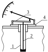 Дилатометрический термометр (рис. 1) состоит из трубки 1, выполненной из металла с большим термическим коэффициентом расширения (латуни, алюминия, стали). Внутри этой трубки находится стержень 2 из материала с малым коэффициентом линейного расширения (инвар, кварц, фарфор). Верхний конец трубки закреплен в головке 4, где находится передаточный механизм прибора. Нижний конец стержня 2 упирается в дно трубки, верхний – в рычаг 3, соединенный с контактами или указывающей стрелкой.