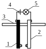 В биметаллических термометрах (рис. 2) используется биметаллическая пластинка 1, состоящая из двух сваренных (склепанных) по всей длине полосок из разных металлов с различным коэффициентом линейного расширения. На свободном конце пластинки укрепляется обычный электрический контакт. При изменении температуры биметаллическая пластинка изгибается, и при достижении заданной температуры закрепленный на пластинке контакт входит в соприкосновение с контактом на неподвижной стойке 2, в результате чего происходит замыкание электрической цепи. Биметаллическая пластинка и стойка закрепляются на основании диэлектриков 3 и соединяются с источником тока 4 и сигнальной лампой 5.