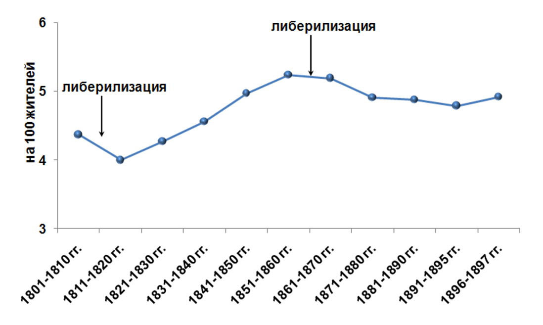 В истории России достаточно четко идентифицируются смены периодов почвенной национально-идентичной идеологии и периодов деидеологизации или переноса неких универсальных иноцивилизационных идеологем. Обратимся первоначально к опыту XIX века. Для анализа был взят показатель динамики рождаемости православного населения страны. Удивительным образом, за оба периода либерализации, связанные с либеральным реформированием Александра I и Александра II, коэффициент рождаемости среди православного населения сокращался. (См. рис. 7) [5]. Те же тенденции упадка фиксируются и применительно к показателям экономики. Если в период Николая I Россия в общих объемах производства занимала 2 - 3 место в мире, то когда грянули «великие реформы» Александра I, и она скатилась сразу на 5-ое место.