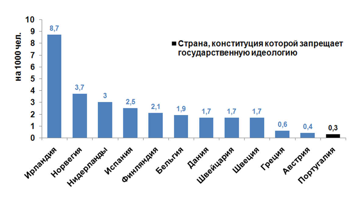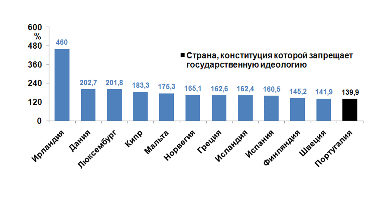 Единственная страна в Западной Европе, в которой существует конституционный запрет на государственную идеологию, является Португалия. Что мы наблюдаем при рассмотрении ее положения на фоне сопоставимых стран? Коэффициент естественного воспроизводства населения Португалии, когда-то еще недавно являющейся одним из Европейских лидеров по показателям рождаемости, оказывается одним из худших в Европе. По динамике ВВП Португалия сегодня, опять-таки, аутсайдер. (См. рис. 4,5). Опять случайность? [3]