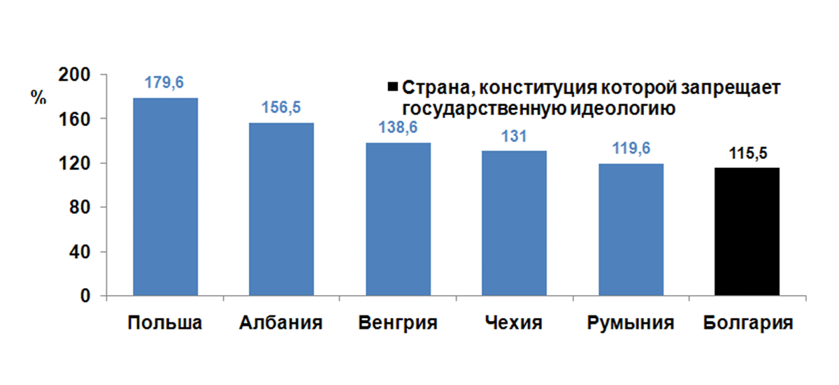 В Восточной Европе такой страной, в которой так же, как и в России запрещена государственная идеология, является Болгария. Посмотрим какая там ситуация в сравнении с иными восточно-европейскими государствами. По коэффициенту естественного воспроизводства населения среди стран Восточной Европы, при общем неблагополучном положении в регионе, Болгария – абсолютный аутсайдер. По динамике ВВП в Восточно-европейских странах тот же худший результат. (См. рис. 2, 3). Случайно ли это?[2]