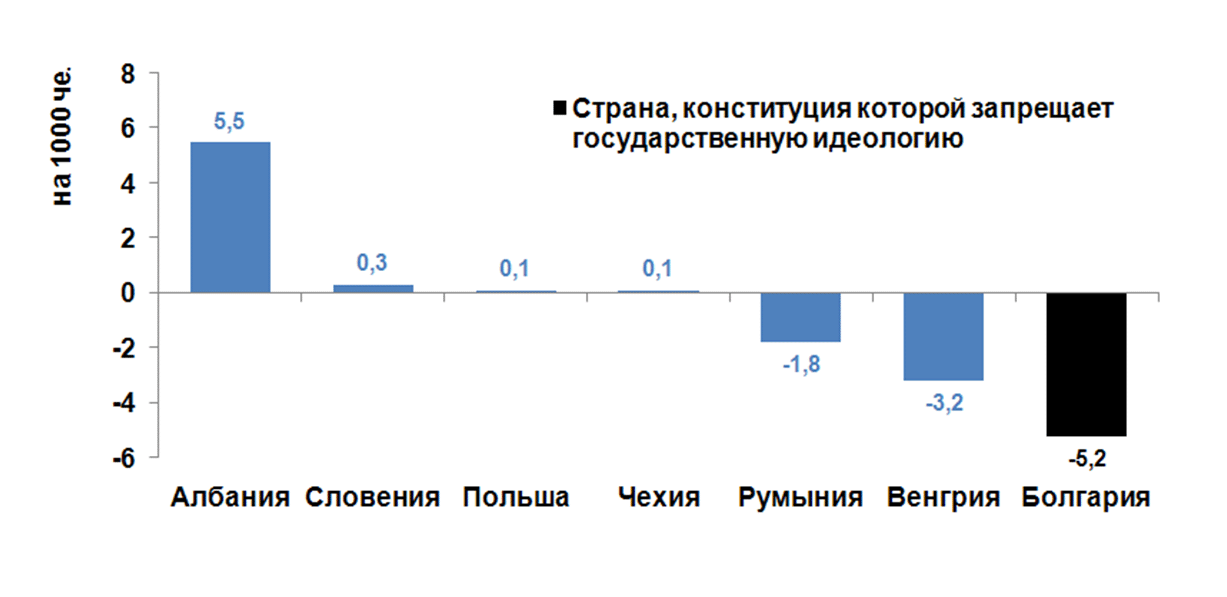 Рис. 2. Коэффициент естественного воспроизводства населения в странах Восточной Европы, прирост на 1000 человек населения