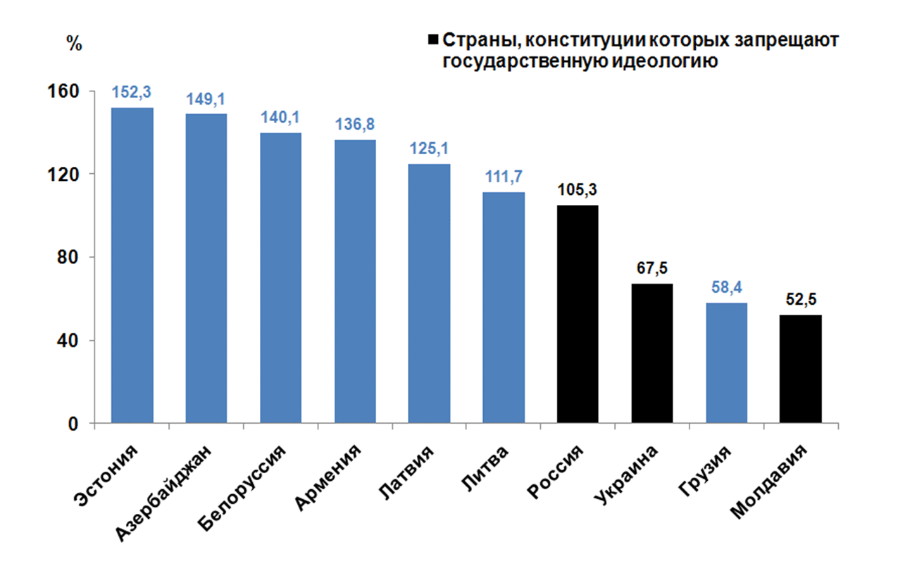 Обратимся теперь к группе из находящихся в Европе бывших республик СССР. В трех из них России, Украине и Молдавии запрещена государственная идеология. Помимо Грузии, представляющей, как известно, особый идеологический случай, по показателю динамики ВВП наблюдается та же самая картина аутсайдерского положения конституционно деидеологизированных государств (См. рис. 6). [4] Переходим теперь к ретроспективному анализу. Посмотрим, как связывалась исторически успешность России с идеологичностью российского государства.