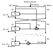На Рис. 2.5 представлена блок-схема одного этапа FEAL. В качестве входа процесса шифрования используется 64-битовый блок открытого текста. Сначала блок данных подвергается операции XOR с 64 битами ключа. Затем блок данных расщепляется не левую и правую половины. Объединение левой и правой половин с помощью XOR образует новую правую половину. Левая половина и новая правая половина проходят через n этапов (первоначально четыре). На каждом этапе правая половина объединяется с помощью функции f с шестнадцатью битами ключа и с помощью XOR - с левой половиной, создавая новую правую половину. Исходная правая половина (на начало этапа) становится новой левой половиной. После n этапов (не забывайте, что левая и правая половины не переставляются после n-го этапа) левая половина снова объединяется с помощью XOR с правой половиной, образуя новую правую половину, затем левая и правая соединяются вместе в 64-битовое целое. Блок данных объединяется с помощью XOR с другими 64 битами ключа, и алгоритм завершается.