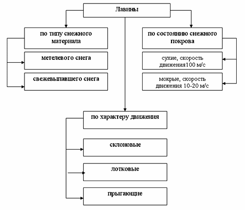 На территории России 18 % площади занимают лавиноопасные районы с высокой степенью лавинной активности, менее 5 % относятся к потенциально опасным районам (Трошина, Глазовская, 1996). Снежные лавины распространены в горных районах Кавказа, Урала, в Восточной и Западной Сибири, Дальнем Востоке, на Сахалине. Виды снежных лавин представлены на рис. 30 .