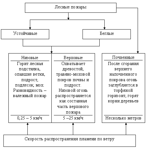 В зависимости от характера и места возгорания леса пожары делятся на низовые, верховые и подземные (почвенные) (табл. ). Лесные пожары могут быть устойчивыми и беглыми.