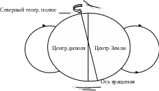 Диполь – это маленький магнитик, смещенный в восточном полушарии от центра Земли на 430 км (рис. 19). Силовые линии магнитного поля «входят» в планету вблизи Северного географического полюса и «выходят» вблизи Южного. Напряженность современного магнитного поля Земли составляет около 0,1 А/м.