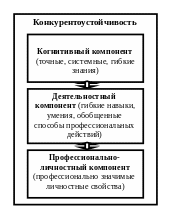 В связи с тем, что конкурентоустойчивость рассматривается нами как высший уровень реализации профессиональной компетентности, то она имеет структуру аналогичную профессиональной компетентности, т.е. соотносится с ней как часть и целое; раскрывает перечень компетенций, существенно влияющих на уровень сформированности конкурентоустойчивости.