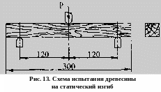 При испытании образец укладывают на две неподвижные опоры с пролетом между их центрами 240 мм. Образец испытывают на изгиб таким образом, чтобы изгибающее усилие было направлено по касательной к годовым слоям (тангентальный изгиб). Нагрузка передается в одной точке (рис. 13).
