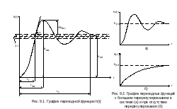 Время регулирования и перерегулирование, основные показатели переходного процесса, тесно связаны между собой. На первый взгляд может показаться, что перерегулирование недопустимо, так как оно увеличивает время регулирования. Однако это не так. Действительно, перерегулирование появляется вследствие того, что система к новому установившемуся состоянию подходит с определенной скоростью, которая графически отображается тангенсом угла наклона касательной в точке А (рис. 9.1):