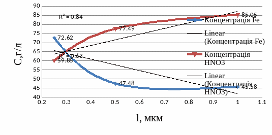 Таблиця 2.4.8. - Ступінь вилучення оксиду заліза (II) у розчинах від розміру частинок