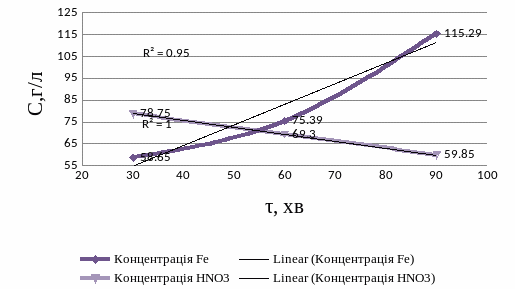 Таблиця 2.4.7. - Ступінь вилучення оксиду заліза (II) у розчинах від часу