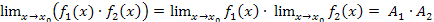 Предел произведения двух функций, имеющих пределы при равен произведению пределов этих функций,