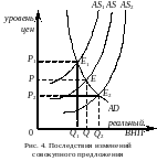 Смещение кривой AS в AS1 (см. рис. 4), которое происходит под влиянием роста издержек производства, приводит к увеличению цен (Р в Р1) и сокращению реального ВНП (Q в Q1). График иллюстрирует инфляцию, обусловленную ростом издержек. Смещение же кривой AS в AS2 вправо иллюстрирует экономический рост и увеличение производственного потенциала (Р в Р2; Q в Q2).