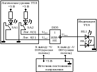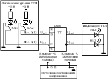 Верхнее положение тумблера соответствует логической «1», при этом наличие логической «1» на выходе DD1 индицируется свечением светодиода; нижнее положение тумблера соответствует логическому «0» и индицируется отсутствием свечения.