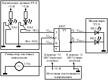 С помощью соединительных проводов подключите два тумблера SA1 и SA2 для подачи логических сигналов на входы D и С триггера. Выходы триггера подключите к входным гнездам на поле «Индикация ТТЛ».