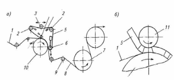 1 – бумажное полотно до крепирования; 2 – ведущий валик; 3 – правильный валик;