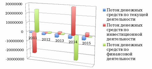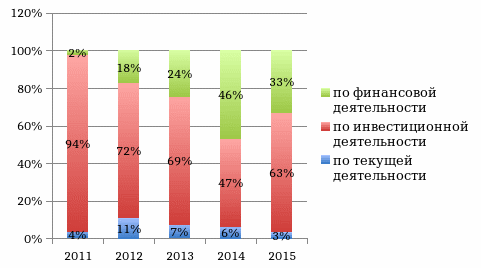 Оттоки денежных средств по текущей деятельности имеют минимальное долю, а максимальное значение в 2013 году - 11%, наибольший удельный вес оттоков по инвестиционной деятельности наблюдался в 2011 году, и составил 94% в общей сумме оттоков. Оттоки по финансовой деятельности имеют наименьшую долю, в 2015 году доля составляет 33%.