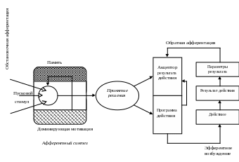 Программа действия (эфферентный синтез). Во взаимодействии с АРД формируется «эфферентная модель программы действия». Осуществляется интеграция соматических и вегетативных возбуждений в целостный поведенческий акт.