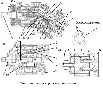 Аксиально-поршневые гидромашины относятся к роторно-поршневым гидромашинам. У аксиально-поршневой гидромашины ось вращения ротора параллельна осям рабочих органов или составляет с ними угол менее или равный 450 (рис. 4).