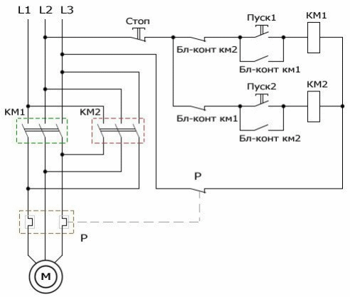 У схемі використовується два магнітні пускачі. При спрацьовуванні першого пускача Km1, його силові контакти притягуються (обведені зеленим пунктиром) і на обмотки електродвигуна поступає напруга з фазуванням L1, L2, L3. При спрацьовуванні другого пускача – КМ2, напруга на двигун піде через його силові контакти КМ2 (обведені червоним пунктиром) вже матиме фазування L3, L2, L1.