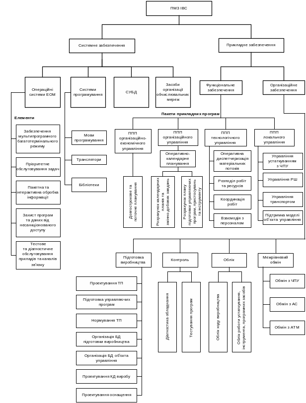 Виняткова складність повного набору розв’язуваних у рамках управління ІВС задач і виконуваних функцій роблять необхідним їх групування на підсистеми, підтримувані відповідними модулями і пакетами ПМЗ. Існуючі в даний час реалізації структур ПМЗ управління виробництвом мають відмінності в тому, що розробники дотримуються власних точок зору щодо принципу декомпозиції ПМЗ управління на модулі. Однак, значна частина таких модулів не залежить від конкретної реалізації виробничої системи, на базі введених раніше принципів такі модулі, представляють собою основу типового рішення структур ПМЗ КСУІВ (рис. 1.9).