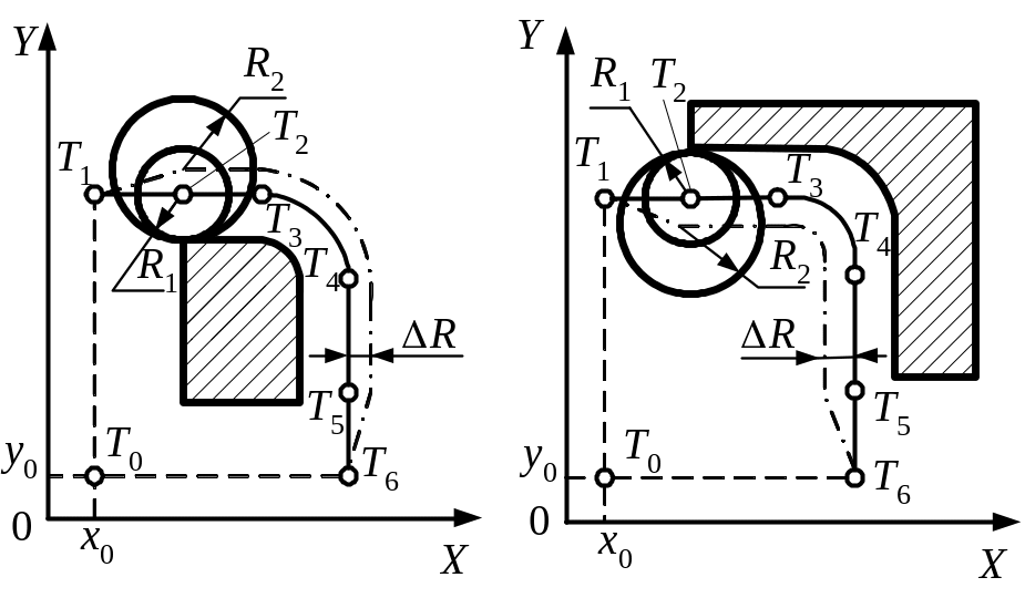Корекція на інструмент ліва і права. Корекція на радіус інструмента при обробці криволінійного контуру кодується функціями G41, G42 в залежності від розташування інструмента (ліворуч або праворуч від контуру, якщо дивитися у напрямку руху інструменту). Наприклад, траєкторія T0–T1–T2–T3–T4–T5–T6–T0 (рис. 7.6, а), що розрахована для обробки зовнішнього контуру фрезою радіусом R, коригується за допомогою функції G41 і коректора № 1 (Т0001 або D01), до якого з пульта системи заноситься зміна радіуса R (в абсолютній системі):