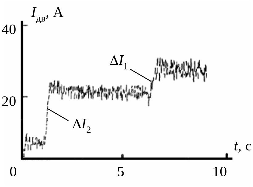 Інший спосіб фіксації поломки полягає в тому, що на підставі даних навчання встановлюють дві верхні межі відхилення навантаження різання від номінального значення, одна з яких відповідає максимально допустимому зношуванню, а друга – руйнуванню інструмента. Перспективним напрямком у діагностиці поломок є виявлення у навантажувальних характеристиках різання топологічно єдиних закономірностей, що відповідають моменту руйнування і навіть попередньому до нього моменту. У тих випадках, коли такі закономірності існують, діагностування поломок зводиться до задачі розпізнавання образу, тобто до задачі виділення об’єкта в тріаді об’єкт – псевдооб’єкт – шум. Найпростішим прикладом може бути осцилограма обертального моменту сили різання при токарній обробці, що оцінюється по струму двигуна Iдв (рис. 6.40).