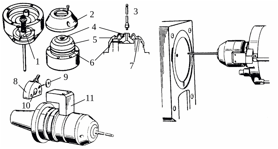 1 – механiчний тригер; 2 – верхня захисна кришка; 3 – щуп; 4, 6 – пружиннi кiльця; 5, 7 – зовнішня та внутрiшня дiафрагми; 8 – модуль прийому вимiрювального сигналу, встановлений на верстатi; 9 – юстирувальна шайба; 10 – котушки iндуктивностi; 11 – модуль передачi вимiрювального сигналу