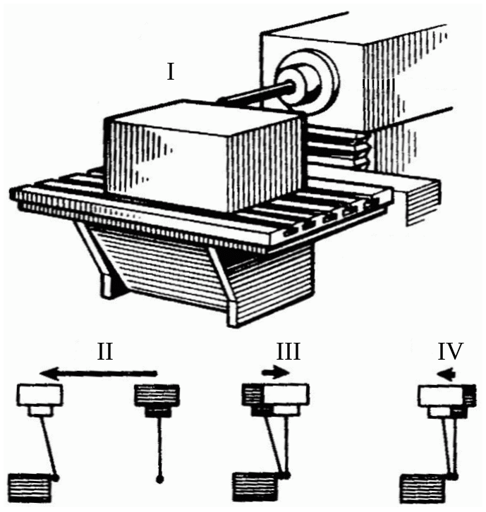 Слідкуючий привід під управлінням пристрою ЧПУ організує наступні відносні рухи вимірювальної головки у напрямку контрольованої поверхні (рис. 6.37): I – вимiрювальна головка в робочiй позицiї; II – підведення до контуру з прискореною подачею i зупинка руху по сигналу нульового переходу; III – відведення головки зі зменшеною подачею до звiльнення щупа, зупинка подачi; IV – повторне пiдведення з малою подачею i остаточна зупинка по сигналу нульового переходу. В результаті вимiрювальна головка генерує сигнал нульового переходу, а пристрiй ЧПУ зупиняє слідкуючий привід i знiмає данi зі шкали перетворювача зворотного зв’язку приводу подачi. Знятi данi пiсля обробки зберiгаються в пам’ятi пристрою ЧПУ як корекцiї, зсуви або данi, що використовуються в умовних переходах. Вимiрювальнi цикли можуть бути стандартними або розробляються як пiдпрограми.