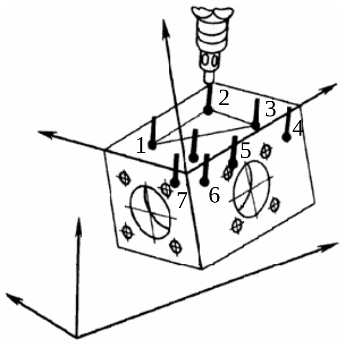 Найпростіший спосіб iдентифiкацiї полягає у перевірці щупом чітких ознак розпiзнавання на палетi або заготовцi. Можна також виконувати обстеження певних характерних поверхонь за наперед розробленими пiдпрограмами. Для контролю фiксацiї палети i розпiзнавання її положення необхiднi дотики щупа в декiлькох певних точках (рис. 6.38). Коректування положення виконується автоматично пристроєм ЧПУ, причому воно зводиться до паралельних перенесень i кутових поворотiв координатної системи.