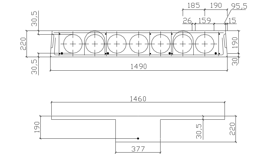 Бетон – тяжелый класса по прочности на сжатие В25. Rbn=Rb,ser=18,5 МПа, Rbtn=Rbt,ser=1,6 МПа; Rb=14,5 МПа, Rbt=1,05 МПа; коэффициент условий работы бетона γb2=0,9. Плита подвергается тепловой обработке при атмосферном давлении. Начальный модуль упругости Eb=27∙103 МПа. К трещиностойкости плиты предъявляются требования 3-ей категории. Технология изготовления плиты – агрегатно-поточная. Натяжение напрягаемой арматуры осуществляется электротермическим способом.